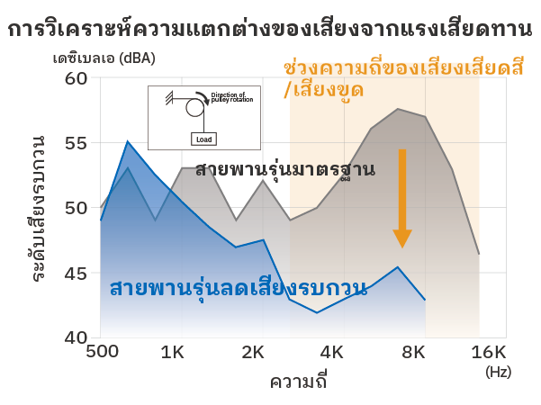 การเปรียบเทียบระหว่างสายพานมาตรฐานกับสายพานชนิดลดเสียง โดยกำหนดช่วงความถี่ของเสียงเสียดสีตั้งแต่ 3 kHz ขึ้นไป พบว่า: