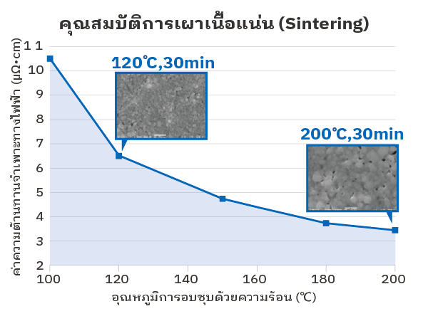 - ด้วยคุณสมบัติการเผาที่อุณหภูมิต่ำ อนุภาคนาโนเงินจะเริ่มหลอมรวมกันที่ 80-100℃ ส่งผลให้เกิดการนำไฟฟ้า