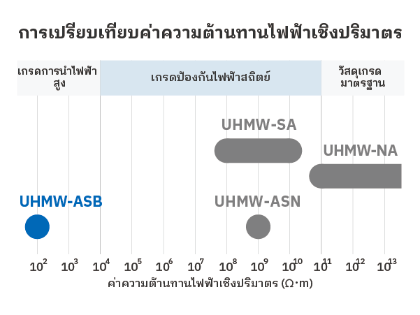 ผลิตภัณฑ์ UHMW-PE เกรดนำไฟฟ้านี้ได้รับการเติมสารคาร์บอนเพื่อเพิ่มคุณสมบัติการนำไฟฟ้า โดยมีค่าความต้านทานไฟฟ้าปริมาตรต่ำเพียงประมาณ 10² Ω·m