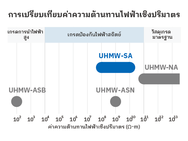 หากต้องการใช้ UHMW-SA สำหรับงานที่ต้องการคุณสมบัติการนำไฟฟ้า กรุณาทำการทดสอบตัวอย่างล่วงหน้าเพื่อประเมินความเหมาะสมก่อนใช้งานจริง