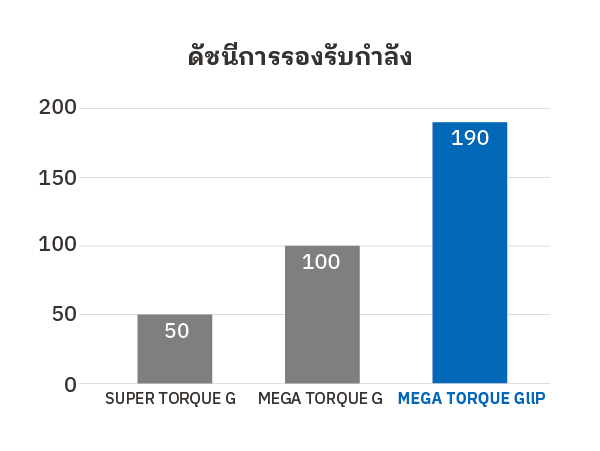 เมื่อเปรียบเทียบกับสายพานไทม์มิ่งเมกะ ทอร์ค จี(MEGA TORQUE G) ของเรา สามารถส่งผ่านโหลดได้สูงขึ้นประมาณ 1.9 เท่า -