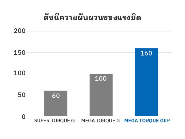 เมื่อเปรียบเทียบกับสายพานไทม์มิ่ง เมกะ ทอร์ค จี(MEGA TORQUE G) ของเรา สามารถบรรลุคุณสมบัติแรงบิดกระโดดได้สูงขึ้นประมาณ 1.6 เท่า