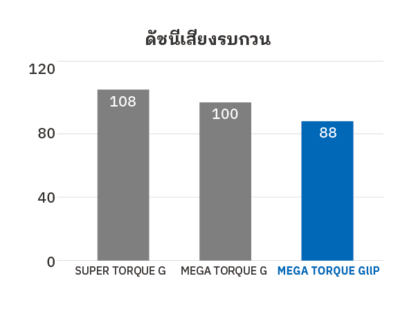 เมื่อเปรียบเทียบกับสายพานไทม์มิ่ง เมกะ ทอร์ค จี(MEGA TORQUE G) เสียงรบกวนลดลงประมาณ 12%